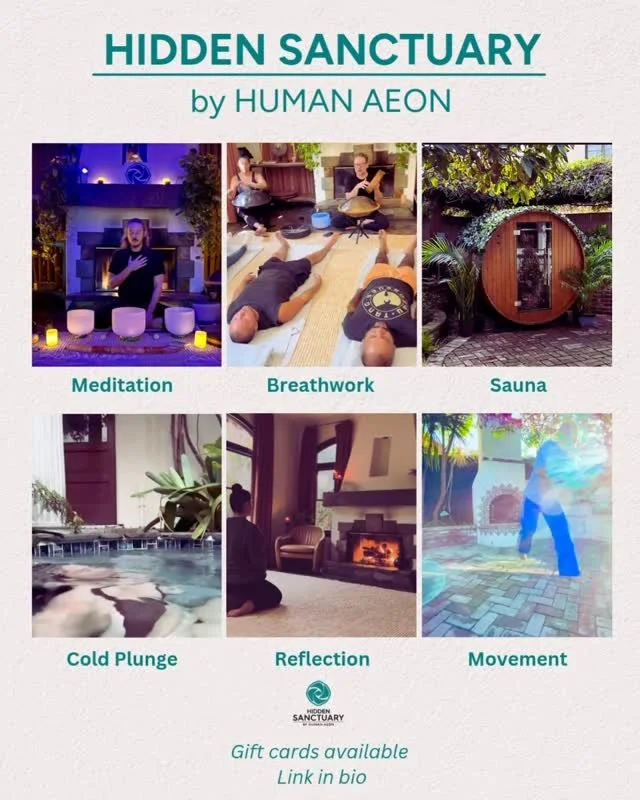 The Hidden Sanctuary is a luxurious oasis designed by Human Aeon for the community to have access to tools to elevate wellness and consciousness. The Hidden Sanctuary is equipped with cold plunges, traditional and infrared saunas, warm water hydrotherapy and more.